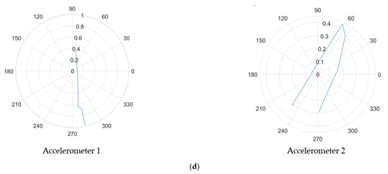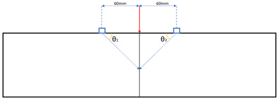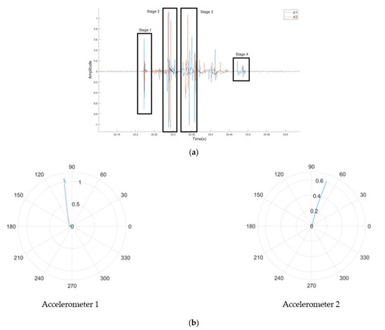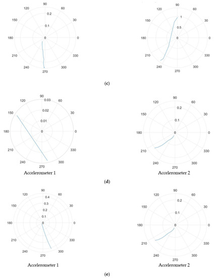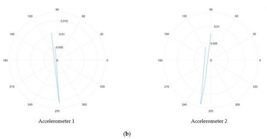 Hodograms have been used as a method to identify crack locations for plain SCC and SFRSCC beams. In addition to the requirement to plot each stage of cracking identified by the amplitude time plots, the locations of the accelerometers will cause each to receive the acoustic emission at a different time, therefore adding to the analysis complexity. Furthermore, there is only a small window to correctly plot the hodogram, and at points it can be as small as 0.0002–0.001 s in duration. The method for finding the correct time window is to visually identify a larger time window from the amplitude–time plots, then slowly reduce its size until the hodogram shows the required rectilinear notation which points directly towards the location of the crack. The hodograms have been used to derive the angle from which AE occurs with respect to the accelerometers as identified in Figure 8. The accelerometers were mounted at the distance of 60 mm from either side of the load point. The vertical distance from the load point was determined by using simple trigonometry. Figure 9 and Figure 10 shows the hodograms for the micro- and macrocrack stages for the plain SCC beam, while Figure 11 shows the results from the SFRSCC beam. All the beams from each concrete type showed similar characteristics and definable stages. Further experiments may provide more understanding of these characteristics. It is clear in the data that multiple clear stages of cracking occur. It would not be unreasonable to investigate the definitions of these stages more clearly with further research. Another experiment would be expected to show similar behaviour and definable stages.