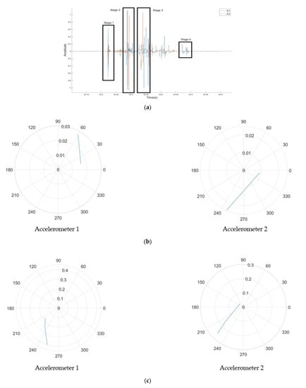 Hodogram analysis for various stages of macrocracks of the plain SCC beam: (a) amplitude–time curves highlighting the analysed sections; (b) hodograms for Stage 1 macrocrack; (c) hodograms for Stage 2 macrocrack; (d) hodograms for Stage 3 macrocrack; and (e) hodograms for Stage 4 macrocrack.