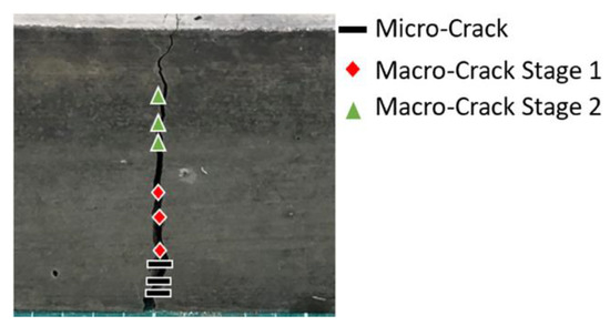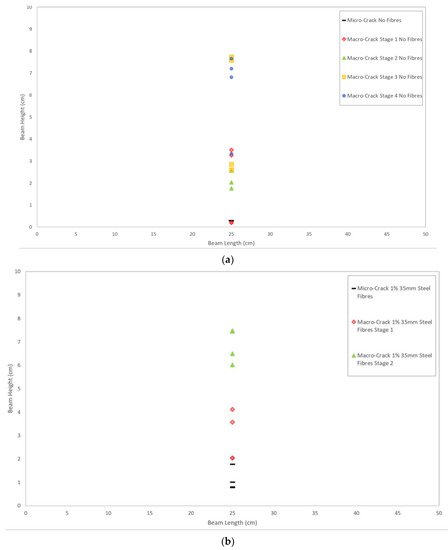 Figure 12a illustrates the crack location trace for the plain SCC beam and it was created using the values from the hodograms. This trace shows each stage of the crack and where it is located on the beam with the bottom left-hand corner of the beam being the plot origin and the crack occurring at its mid-point (25 cm). The trace clearly shows the initiation of the crack at its lower surface and sequentially moves towards the upper surface where the load is applied. Notably, on the trace there is some areas where the cracking stages are mixed—this is due to errors in the margin or identification of the crack time. Irrespective of these errors, the trace still follows the expected trends of the crack emanating from the bottom of the beam (the area under tension) to the top of the beam (the area under compression) as concrete’s material properties lend better to compression rather than tension [62]. Figure 12b displays the crack location trace for the SFRSCC beam. This beam shows a much clearer trend to the plain SCC beam with defined areas of micro- and macrocracking occurring from the lower surface of the beam to the upper surface. The same markers are used to define the crack stages as used in Figure 12a to ensure the results are easily comparable. Furthermore, a physical representation of the hodogram plots for the SFRSCC beam is shown in Figure 13. The stages of cracking are indicated where they are physically occurring on the beam.