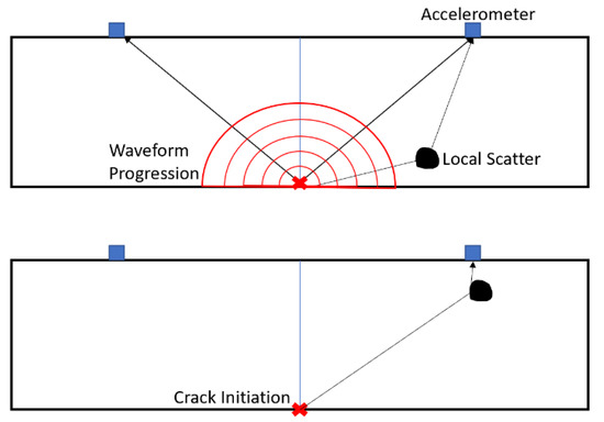 The hodograms use the initial part of the waveform, which presents as a rectilinear component and ‘points’ to the crack source. The later parts of the waveform present as circularly/elliptically polarised components and represent resonant modes of the clamped block. This is supported by the frequencies occurring as multiples of the beam’s dimensions. Furthermore, the order of the tear is supported by the hodogram analysis (bottom to top). However, some of the crack locations show values that lie outside of the beam’s boundaries. This is suggestive of a local scattering effect and could be a large piece of aggregate that causes rebounding waves, taking a different path to the original AE, thereby skewing the hodogram plot as shown in Figure 14. It must be acknowledged that concrete’s material properties are inhomogeneous in nature.