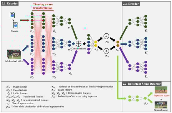 The details of the new method for the detection of important scenes in baseball videos via the Tl-MVAE are shown in this section. As shown in Figure 1, the Tl-MVAE consists of an encoder (Section 2.1), a decoder (Section 2.2), and an important scene detector (Section 2.3). Each of them is explained in detail below. The final loss and the optimization of the parameters of the encoder, decoder, and important scene detector are also shown in Section 2.4.