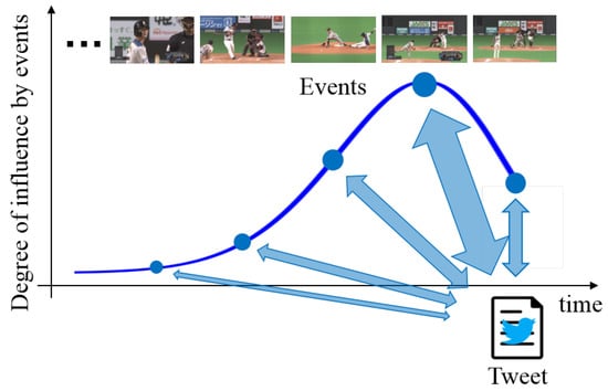 In order to use both tweets and videos, we need to consider multiple different modalities. Several methods focusing on the relationships across multiple different modalities have been proposed [,,]. The method in [] realizes efficient cross-modal video-text retrieval using multi-modal features such as visual characteristics, audio, and text. Then, the method in [] learns multimodal embeddings between modalities such as text, video, and audio via deep canonical correlation analysis. The method in [] has a multimodal variational autoencoder (MVAE) [] including a fake news detection network using tweets and visual information, and the performance has been improved. Thus, MVAE is effective for our task, which is the detection of important scenes using tweets and videos. Generally, the MVAE can detect correlations across modalities by training shared representations across them. Since the MVAE can flexibly express the relationship between heterogeneous modalities, the construction of a highly accurate method for our tasks is expected by adopting the MVAE. However, to efficiently use tweets and videos, we need to consider the following problem. Since tweets posted on Twitter are influenced by multiple previous events in the videos, they are closely related to each other. Thus, there are time-lags between posted tweets and multiple corresponding events. Since these time-lags cannot be considered in previous MVAE-based approaches, the development of the MVAE-based detection method considering time-lags between posted tweets and multiple corresponding events would contribute to an improvement in performance.