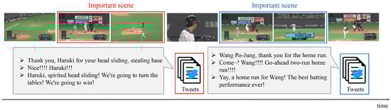 The generation of highlights is one of the important techniques for enabling a long game to be watched in a short time. Highlights consist of important scenes such as scoring and home runs. Therefore, since important scene detection methods are necessary for the generation of highlights, various detection methods have been proposed [,,,,,,]. The methods in [,,] using videos detect important scenes by applying a hidden Markov model and a maximum entropy model to player movements and cheers from the audiences obtained from the target videos. Therefore, conventional video-based methods are effective for the representation of visual information of players and audiences. On the other hand, along with the development of microblogging services, methods using Twitter (https://twitter.com/ (accessed on 12 March 2021) for the detection of important scenes have been proposed [,,]. By using Twitter, which is one of the microblogging services, the reactions of viewers during games can be obtained. People watching baseball games often post tweets, which are short text messages, related to games. Since posted tweets often include information on the reactions of viewers and the contents of the games, conventional Twitter-based methods have an advantage for the extraction of opinions or feelings of viewers. Therefore, by taking advantage of each modality, it is expected that a method using both Twitter and video analysis would enable high-quality detection of important scenes.