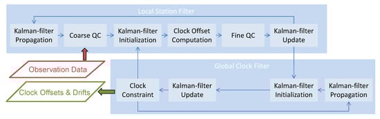 After the second data quality control, the Kalman-filter is updated using all pseudorange and carrier-phase measurements which have not been rejected. Single, un-combined observations are used for the update. After the successful filter update, the state vector and covariance information are passed to the global clock filter, for merging the satellite clocks with the results from other local filters. More details on the merging process are provided in the following section. This last step concludes one complete station filter update cycle. As new measurements arrive for this station, the Kalman-filter state is predicted to this epoch and the processing loop starts again.