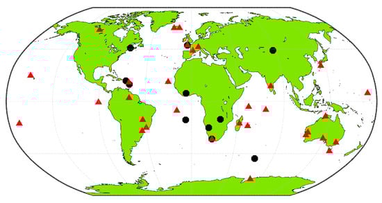 - Eleven IGS stations are used for the L1/L5 analysis, shown in black in Figure 2. These stations are chosen by ensuring that they provide observations from the novel B1 and B2a BeiDou-3 signals, as well as GPS L5 measurements. Additionally, due to the limited number of stations observing these signals, they are split into 6 h sessions, and only the sessions with more than four visible GPS IIF satellites are kept for processing. The processed signals are L1/L5 for GPS, E1/E5a for Galileo, and B1/B2a for BeiDou-3; therefore, both frequencies are the same for all three constellations: 1575.42 and 1176.45 MHz.