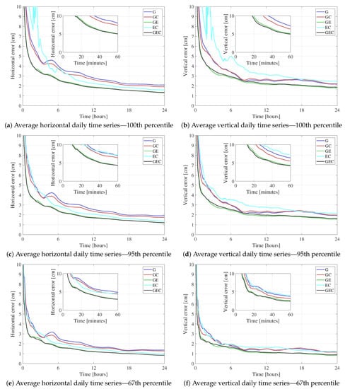 When only processing Galileo and BeiDou, it appears that both horizontal and vertical components at the 100th percentile are noisy and have several jumps, leading to relatively high rms and a convergence time which reaches 146.5 min. This behavior is due to some outlier datasets having a very low number of visible satellites because of the location of the station, time of day, low elevation angle, etc. Such datasets have high errors, which adversely affect the average solutions. These outliers are eliminated in the 95th and 67th percentiles, where the EC combination is comparable to the other combinations.