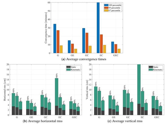 The datasets have also been processed in kinematic mode with position state process noise typical of a car (120 km/h), in order to assess the performance when the position is not averaged out throughout the processing. Doing so leads to more variations in the position estimates, and therefore slightly higher rms. The rms from the kinematic processing are summarized in Figure 4, along with the static rms. It is clear that kinematic processing leads to slightly higher rms in both horizontal and vertical components. When it comes to comparing the different constellation combinations, the same conclusions hold compared to the static case. One interesting observation is that, in static mode, the horizontal and vertical rms have very close values. In some instances, the vertical rms is smaller than the horizontal one, which goes against the fact that the vertical component cannot be estimated as well as the horizontal one due to the satellite geometry, due to all satellites being above the receivers. Such behavior could be due to the averaging power of static processing. However, in kinematic processing, the vertical components are a few centimetres higher than the horizontal ones, which is more realistic and expected.