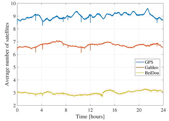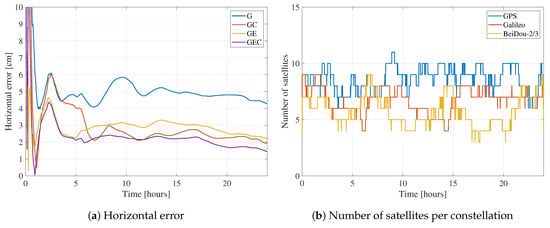 When it comes to the constellation combinations containing GPS, these results indicate that the GPS-only solution has higher rms and convergence time compared to GE, GC, and GEC. This behavior is expected, as adding constellations improves the geometry and increases the number of measurements, which is helpful in a technique that is as measurement-dependent as PPP. On the other hand, GE results have lower horizontal and vertical rms and convergence time compared to GC. This behavior means that, with regards to a GPS-only solution, adding Galileo improves the solution more than adding BeiDou. The most probable reason behind this difference is that BeiDou has a lower number of visible satellites globally compared to Galileo. Figure 5 shows the epoch-by-epoch average of the number of processed satellites from all three constellations, based on all processed datasets. Although this number of satellites time series does not represent the number of satellites at a specific location or on a specific day, it is helpful to show that, on average, only three BeiDou satellites are processed compared to averages of seven and nine for Galileo and GPS, respectively. Note that BeiDou GEO satellites are not included in the processing, and that some stations have a low number of visible BeiDou satellites, as not all stations tracked BeiDou-3 signals. This low number of BeiDou satellites would explain the GC performance compared to GE. On the other hand, GEC solutions are very close to GE in terms of performance. To understand the reason behind this behavior, the results from one of the datasets with a relatively big number of BeiDou satellites are shown in Figure 6. The dataset has six BeiDou satellites on average, compared to nine for GPS and seven for Galileo. Both BeiDou and Galileo improve the GPS-only solution. However, minimal differences exist between both GE and GC solutions and the GEC solution. This limited impact of the third constellation could be due to the fact that the average number of satellites is already high enough with two constellations that an additional one does not have significant effect.