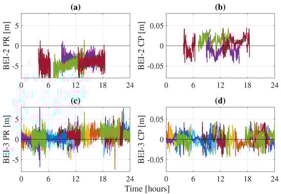 BeiDou-2 and BeiDou-3 suffer from the existence of clock and time delay biases between both generations. Jiao et al. [] showed the existence of these biases between BeiDou-2 and BeiDou-3. They noticed that the biases are receiver-dependent, as some receivers suffer from significant biases, while others do not. Improvements have been noticed when estimating the BeiDou-2 and BeiDou-3 Inter-Signal Biases (ISB) as random constants. Zhang et al. [] showed that not taking these ISBs into account affects the Signal-In-Space Ranging Errors (SISRE) of the satellite orbits, while Li et al. [] showed their effect on both receiver and satellite DCB estimation.