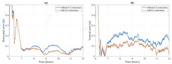 Average horizontal (a) and vertical (b) errors for station CRO1 on DOY 186, 2020 between UTC Hours 6 and 12. GEC constellations processed in kinematic mode on [L1,E1,B1]/[L5,E5a,B2a] frequencies, with and without the application of the GPS L5 corrections.