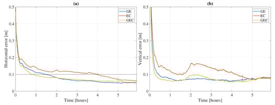 Average horizontal (a) and vertical (b) errors based on 80 datasets in kinematic mode using [L1,E1,B1]/[L5,E5a,B2a] signals with GE, EC, and GEC. The horizontal black line represents the convergence threshold, defined based on the horizontal error.
