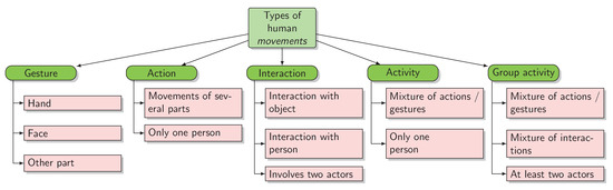 - Activity—this is a complex category. An activity can be perceived as a series of several actions. Unfortunately, there are not many datasets that provide information for this category. Depending on the order of the actions in the sequence, we can have one activity or another, so the temporal component has an important role.