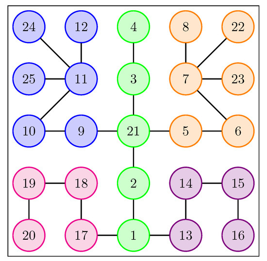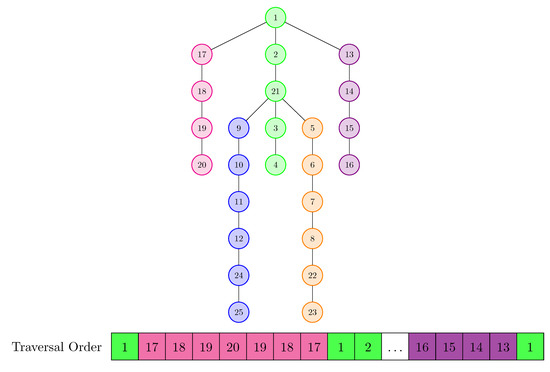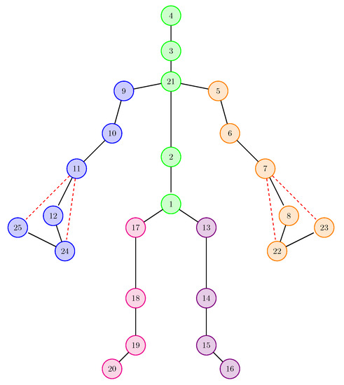 The second proposed reorganization is a linear one and is inspired by Yang et al. [31]. We chose as the root for the proposed tree the central joint (the one with index 1), considering that it has a special importance, reason for which it was also used for the normalization step. The proposed tree is shown in Figure 4 and contains all 25 joints. We also considered the order in which the sub-trees for the root were added. Starting from this tree, we made a linear rearrangement of the joints starting from the DFS (Depth-first search) traversal of the tree. In this way, we made sure that any two nodes that appear side by side in the arrangement are also adjacent in the skeleton graph.