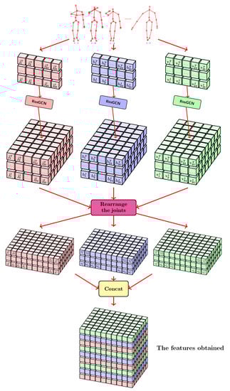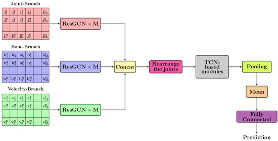 The general scheme of the proposed TCN-based architectures is presented in Figure 6. For each branch, M layers of ResGCN type are applied to extract spatial features. This part of extracting spatial features is inspired by the architectures proposed by Song et al. [7]. After spatial features have been extracted for each branch, we concatenate all features. Because we propose to use a module based on TCN type layers that will be able to extract both temporal and spatial features simultaneously, it is necessary to perform a rearrangement of the joints/bones. The proposed rearrangements are detailed in Section 3.1.1.