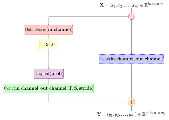 Architecture of a TCN type unit. The convolutional layer of the blue block is used only if . T represents the size of the temporal window, and S represents the size of the spatial window. If then and , where n represents the number of frames and m represents the number of joints.