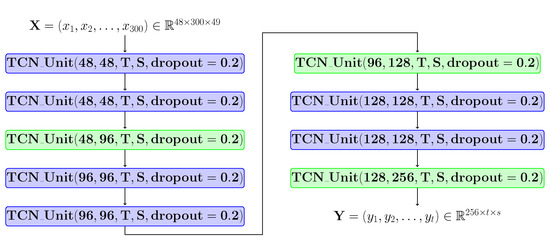 T represents the size of the temporal window, and S represents the size of the spatial window. For the blue blocks, the stride has the value 1, and for the green ones, the stride has the value 2. 300 represents the maximum number of frames, and 49 represents the number of analysed joints (results after the linear rearrangement described in Section 3.1.1). For each TCN type unit, the padding is determined based on the T and S values.