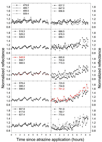 The normalized reflectance/fluorescence (normalized to the measured value at time 0) of Catharanthus roseus at different wavelengths as a function of the time since atrazine application. Values in the figure legends indicate the wavelength at which the reflectance/fluorescence was measured (nm). The two data sets in red indicate the wavelengths used for the development of the fluorescence-based stress index.