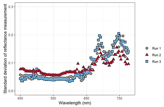 To confirm that the application of atrazine caused changes in chlorophyll fluorescence intensity, changes in the normalized reflectance/fluorescence were analyzed. These changes over time depended on wavelength, with wavelengths from 640 nm to 750 nm exhibiting a relatively large increase in reflectance/fluorescence over the duration of the experiment (Figure 2). The changes in the measured reflectance/fluorescence at different wavelengths over the course of the study were quantified by calculating the standard deviation of the normalized reflectance/fluorescence at each wavelength across all time periods, with a higher standard deviation indicating larger changes in the normalized reflectance/fluorescence. The largest variation in the normalized reflectance/fluorescence occurred at wavelengths above 650 nm, with peaks at 680 and 750 nm (Figure 3). The standard deviation of the normalized reflectance/fluorescence was low and similar at wavelengths from 450 to 600 nm.