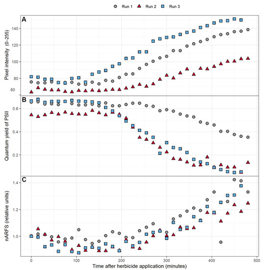 Over the course of the experiment, the intensity of the 50 × 50 pixels area near the fluorometer and reflectance measurement site increased, indicative of increased chlorophyll fluorescence (Figure 4A). There was variability in the pixel intensity among the three replications, but the change in pixel intensity followed a similar pattern for all three plants. Pixel intensity was relatively stable for the first two to three hours, after which it gradually increased. Likewise, ΦPSII was relatively stable for the first two to four hours, after which the ΦPSII gradually decreased (Figure 4B). A slight dip in nARFS occurred during the initial 215 min after atrazine application in two of the three replications. This was followed by a strong increase in the nARFS during the remainder of the 8-h period (Figure 4C), during the same time that the pixel intensity increased and ΦPSII decreased.