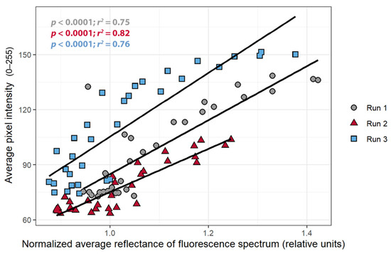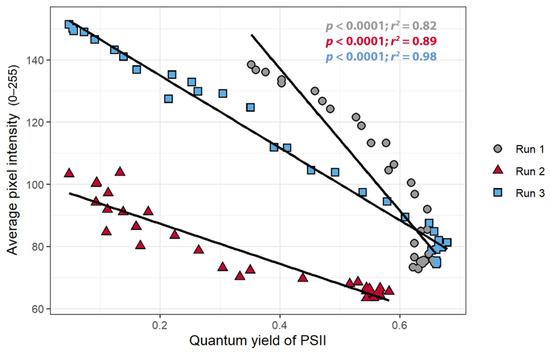 The primary goal of the study was to establish whether the pixel intensity acquired from the chlorophyll fluorescence images can be used to detect stress in the plant. Comparing the pixel intensity to ΦPSII verified that changes in pixel intensity are indeed indicative of physiological changes in the plants. There was a strong negative correlation between the pixel intensity and ΦPSII in all three replications (r < −0.90): as the pixel intensity decreased, the ΦPSII increased (Figure 5). This relationship was present, but quantitatively different among the three plants, indicative of the non-quantitative nature of our CFI approach.