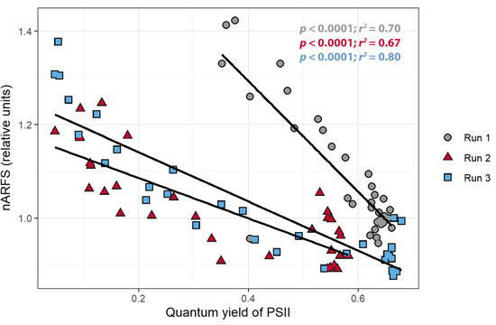 To confirm that a change in pixel intensity was associated with a change in chlorophyll fluorescence, the relationship between the pixel intensity and nARFS was examined. A strong positive correlation between the pixel intensity and the nARFS was seen in all replications (r > 0.86; Figure 6), but once again this relationship differed among the three plants. There was a negative correlation between the nARFS and ΦPSII (r < −0.82, Figure 7), indicating that changes in nARFS were related to changes in the photosynthetic efficiency of the plant.