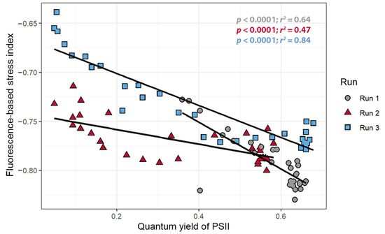 The FBSI was calculated for each timepoint and there were strong, negative correlations between the FBSI and ΦPSII for all three replications (r < −0.8, Figure 8), but once again these correlations were quantitatively different among the three plants.