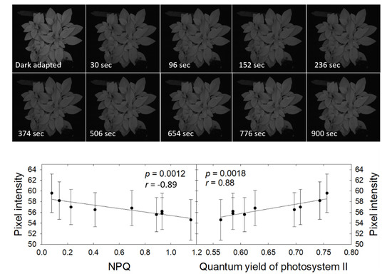 The petunia plant fluoresced notably more brightly when dark-adapted than following a 15-minute exposure to a photosynthetic photon flux density of 550 µmol m−2 s−1 (Figure 9). The fluorescence intensity increased gradually following the light exposure, from a pixel intensity of 54.6 ± 3.8 at 30 s after the end of the light exposure to 59.6 ± 3.6 after 15 min. This increase in fluorescence was not clearly visible in the CFI images, but easily quantified. Pixel intensity was negatively correlated with NPQ and positively correlated with ΦPSII. Both correlations were highly significant, indicating that changes in pixel intensity in CFI images can be used to qualitatively follow downregulation of NPQ along with the associated increase in ΦPSII.