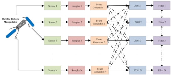 As depicted in Figure 1, it is supposed that all the sampler of sensors are time-driven with sampling instants  and zero-order-holders are event-driven. The sampling period is set by . The measured output of sensor m can be obtained in Equation (8):