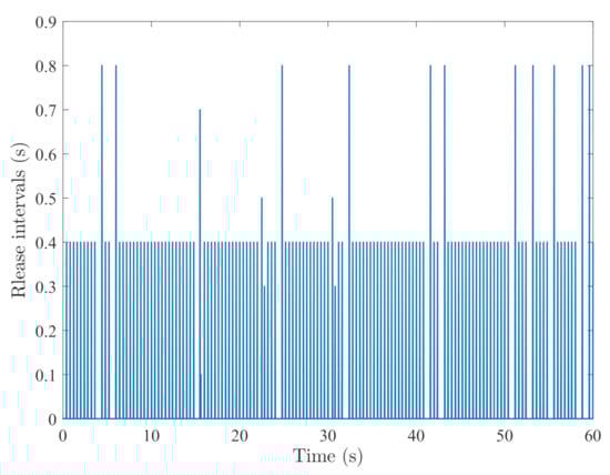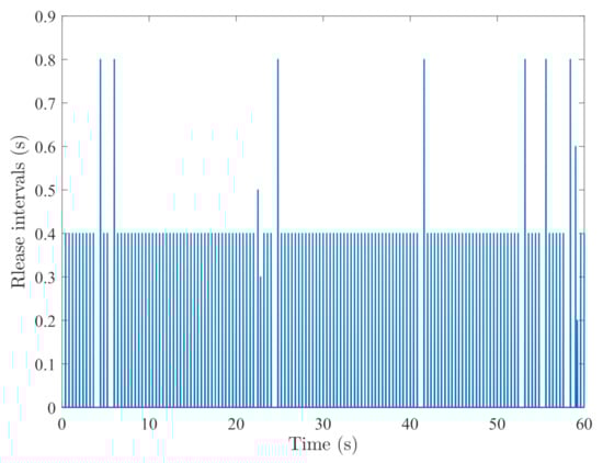 By random initial conditions for sensor nodes, Figure 3, Figure 4, Figure 5 and Figure 6 show the state trajectories of the filtering errors with disturbances. It can be seen that all the filtering errors can converge to zeros despite of system mode jumping and external disturbances, which means that the designed mode-dependent filters can effectively estimate the true state of flexible manipulator according to Definition 1. This also implies that the filtering errors  for all sensors can be mean-square stable when there is no disturbance, which can verify our derived results. Figure 7, Figure 8, Figure 9 and Figure 10 depict event triggering instants and release interval of the sensors, where the release intervals are larger and the signal transmission among the sensors is event-triggered instead of traditional time-triggered schemes. It can be found that the developed event-triggered strategy can considerably decrease the numbers of communications compared with tradition time-triggered schemes (time-varying sampling periods of 0.1 s and 0.2 s). This shows the considerable advantages on decreasing signal transmissions among the sensor networks, where the event-triggered instants are larger than the tradition time-triggered instants. Thus, the simulation results can support our developed filter designs.