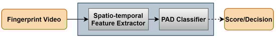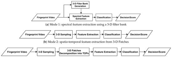 The proposed PAD subsystem is designed in a fashion that leverages the dynamic information provided during the fingerprint presentation (Figure 1). Thus, the proposed feature extraction approach suggests exploiting the spatio-temporal features to achieve a robust description that characterizes the complete interaction between the fingerprint and the sensor’s surface. Toward this end, we propose three modes to investigate fingerprint dynamics in frequency and time domains. Five feature extractors are therefore selected to achieve a description that discriminates genuine from attack presentations. By feeding the extracted features into a pre-trained classifier, the PAD subsystem finally decides whether the input video is a bona fide or attack presentation. The following subsections expound the processing modes, feature extractors, and classification method.
