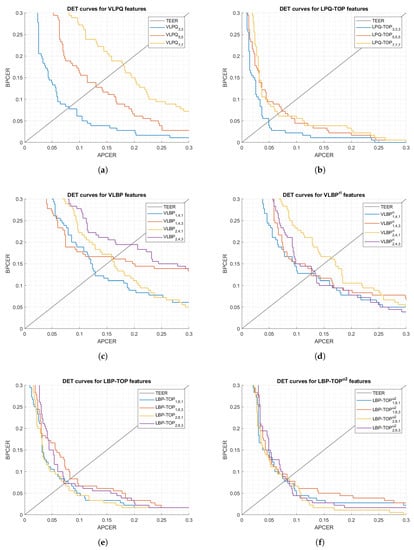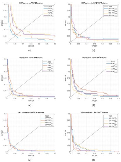 The first set of analyses examined the impact of (i) the size of 3-D samples used in the processing mode, and (ii) selecting rotation invariant or uniform features, on the feature extractor performance. Figure 5 and Figure 6 show DET curves for VLBP, LBP-TOP, VLPQ, and LPQ-TOP with the corresponding sampling parameters. The figures confirm that 3-D spectral features (i.e., VLPQ and LPQ-TOP) performs better at smaller sampling size, and the accuracy degrades considerably when comparing the smallest and largest sampling size. An exception is noticed for the LPQ-TOP when executed on the optical sensor. On the other hand, 3-D spatio-temporal features (i.e., VLBP and LBP-TOP) have not revealed a general correlation between sampling size and accuracy. However, it is evident that rotation invariant and uniform features do not necessarily improve the accuracy in most of the cases but nonetheless no significant degradation has taken place after considering those features.