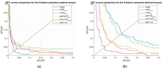 DET curves comparison of the proposed feature extraction algorithms using different parameters (thermal sensor).
