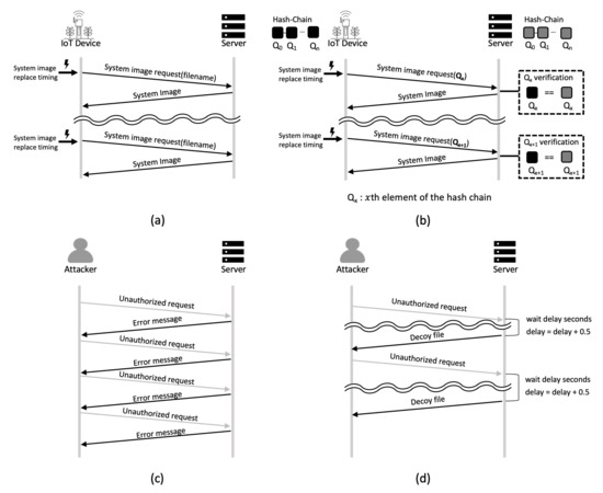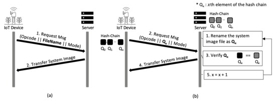 Figure 6b shows the flow chart of the TFTP-compatible file access control. The IoT device writes the value of the xth element of the hash chain in the file name area of the TFTP read request (RRQ) packet and transmits the packet to the server. The server verifies that the file name matches which is the element of the hash chain supposed to be used for this request message. If the file name and match, the server sends the appropriate system image to the IoT device. Then, the server sets to a value to be used at the next request message. This means that the server sets the name of the next system image file of the IoT device to . At the next request, the server expects the IoT device to use as the file name. Since the IoT device and the server change the element of the hash chain they use every time they communicate, each of the elements is used only once.