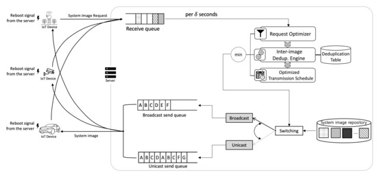 Additionally, as shown in Figure 3, we propose an adaptive transfer method to handle demanding network resource consumption in IoT platforms that include a large number of IoT devices. Based on the resource-efficient file transfer method, termed adaptive transfer, we can minimize the network resource consumption for transmitting system images of IoT devices in IoT platforms. This allows the server to transmit the system images by using network resource as efficiently as possible. To this end, the server uses both unicast and broadcast for file transfer. To determine an appropriate transfer method, the server performs request optimization and inter-image deduplication. The request optimizer makes the server transmit the system image by using broadcast when there are heavily duplicated requests for the same system image. The inter-image deduplication engine outputs duplicated system image blocks and extra blocks which can be retrieved from the deduplication table.