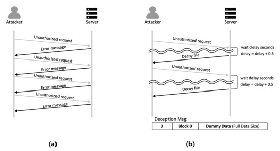 On the TFTP, when a data block smaller than the data block size is transmitted, this block is considered to be the last block of the data. For example, when using 512 bytes as the data block size, the server divides the file to be sent into 512 byte blocks to respond to a client’s file request. When a client receives a block of data smaller than 512 bytes, the client recognizes that the transfer is complete and stops receiving the file as the last part of the file will be smaller than 512 bytes. If the file size is an exact multiple of 512 bytes, the server sends an additional data block of 0 byte to indicate the end of the file. In this situation, when the client receives a data block of 512 bytes, it recognizes that there is an additional data block to be transferred and continues receiving the file. The attacker deception technique proposed in this paper uses this feature of the TFTP. The server sends data blocks with maximum sizes instead of error messages to the attackers to prevent attackers from recognizing that they should repeat other attacks immediately. In addition, the server maintains an integer variable named which decides the time the server should wait before transmitting the decoy files. Whenever there is a request message with a file name that does not exist on the server, the value of this variable increases by 0.5 s. The higher the value of is, the longer the server waits before it transmits decoy files to the attackers. In addition, the server makes sure that the does not become more than 3 s to prevent the time out error. In this way, the server can significantly increase the time required for attackers to perform brute-force attack. Figure 7a shows the flow chart of attacking a server which is using the native TFTP. An attacker can instantly determine whether a file exists on the server by looking at the error message. However, as shown in Figure 7b, when the proposed attacker deception technique is deployed, attackers cannot recognize if the file they received from the server is a decoy file right away. This makes it difficult for the attackers to decide if they should proceed with the next attack. Additionally, as the brute-force attack targeted at the server is repeated, the time taken to receive the response from the server will increase. This leads to an increase in the time interval between attack attempts. Brute-force attack is a basic attack in which a large number of attacks are performed in a short time period. Since the brute-force attackers have to wait between attacks, the proposed method increases the total attack time. This increased attack trial time makes obtaining real files infeasible.