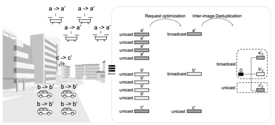 Figure 8 shows two types of deduplication which can be performed in the proposed FLEX-IoT platform. In FLEX-IoT platform, many IoT devices would use the same system images since there would be lots of IoT devices deployed for the same or very similar purpose. For example, let us say that there are four drones which need to change their system image from a to , four cars which need to changes their system image from b to , and a surveillance camera that needs to change its system image from c to at the same time.