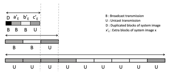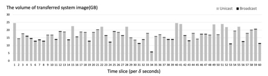 When the requests for the system images are not duplicated heavily, the server uses unicast. Assuming that are the requests that duplication is removed, the volume transmitted by using broadcast () can be written as . Again, we can write the volume of the system image that is not heavily duplicated and transmitted by using unicast as . Since using broadcast can have a negative effect on the network such as broadcast storm, the proposed technique also considers the amount of broadcast transmission when deciding which method of transmission to use. We call the broadcast overhead constant. We add the multiplication of and the volume of system image blocks transmitted through broadcast () to the total volume of system images to be transmitted.