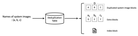 Inter-image deduplication is performed by using the pre-calculated deduplication table as shown in Figure 10. The deduplication table accepts a combination of system images as input and it outputs deduplication results. The deduplication results consist of three types of data as shown in Figure 10. Duplicated system image blocks, which is denoted as D, are blocks that correspond to overlapping parts of the system images. Extra blocks, which are denoted as [name of the system image], are blocks that do not duplicate one system image with another. The index block is used to recover the original system image based on the system image blocks. Since the deduplication table is calculated and stored in advance, it does not consume significant resources on the server to get the deduplicated system images of any combination from the deduplication table. Compared to the resources required when the server transmits all system images to a lot of the IoT devices through unicast, the resources needed for acquiring deduplicated system images is minimal.