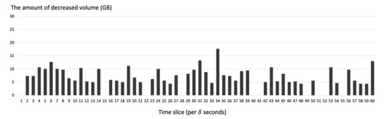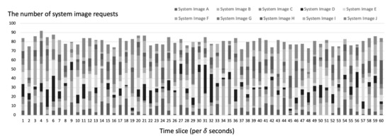 Figure 13 shows the system image request scenario of a FLEX-IoT platform. This scenario was generated based on the assumption that there are 2000 IoT devices on the IoT platform. We used Poisson distribution with parameter to generate the random time interval between requests. Each time the system image request was generated, the corresponding system image was selected based on the randomly generated probabilities which were changed per time slice. We changed these probabilities regularly on the assumption that the number of requests for each system images would dynamically change depending on the environment of the IoT platform. In addition, we assumed that the broadcast overhead constant is 20.