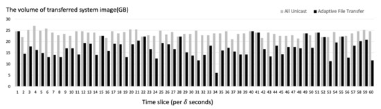 Figure 14 shows the total volume of the transmitted system images when . When the server used adaptive transfer that employs both unicast and broadcast to transmit system image files, the total volume of transmission per time slice was generally much lower than when the server used only unicast. When there are more than 15 duplicated requests for the same system image every seconds, the server adopted broadcast as the transfer method. In most cases, when there are less than 15 duplicated requests for the same system image per seconds, the server used unicast.