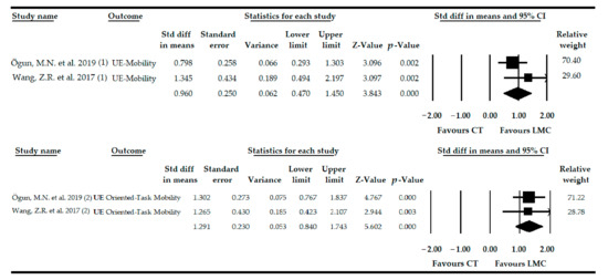 Two studies [79,80] with 2 independent comparisons provided data from 91 patients diagnosed with stroke. Forty-six patients (58.39 ± 4.36 years old) received LMC therapy in the intervention group, and 45 participants (56.57 ± 4.49 years old) received other therapies as a control intervention. Very low-quality evidence of a large effect of LMC-based therapy (SMD = 0.96; 95% CI = 0.47, 1.45; p < 0.001) was shown on UE mobility in patients with stroke (Table 4, Figure 2). Although the risk of publication bias was not assessed, it must be considered high due to the low number of studies included. Heterogeneity was not present (I2 = 0%, p = 0.31), and the precision of the findings was low (45.5 participants per study). The leave-one-out method yielded pooled estimates that varied 37% when compared to the original pooled effect.