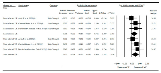When the subgroup analysis was performed in the most affected UE, LMC did not produce an effect on GS independently if it was used alone (SMD = 0.38; 95% CI = −0.23, 1.00; p = 0.21) or combined with CT (SMD = 0.63; 95% CI = −0.09, 1.37; p = 0.089) compared to CT. Similar results were found in the least affected UE when LMC was used alone (SMD = 0.20; 95% CI = −0.36, 0.77; p = 0.482) or when a CT program was added (SMD = 0.50; 95% CI = −0.22, 1.23; p = 0.177).