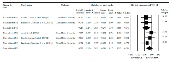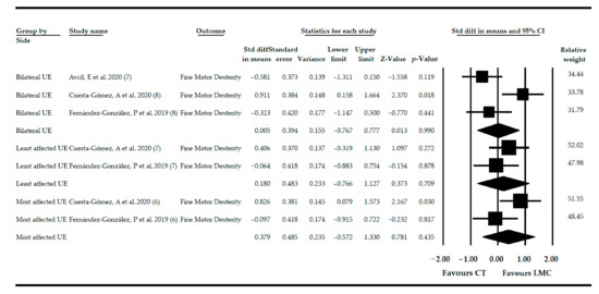 When subgroup analysis was performed, only very low-quality evidence of a high effect of LMC and more CT (SMD = 0.82; 95% CI = 0.07, 1.57; p = 0.032) was found in the most affected UE and in bilateral UE (SMD = 0.91; 95% CI = 0.15, 1.66; p = 0.018), both versus CT, on FMD in patients with non-acute CNSD.