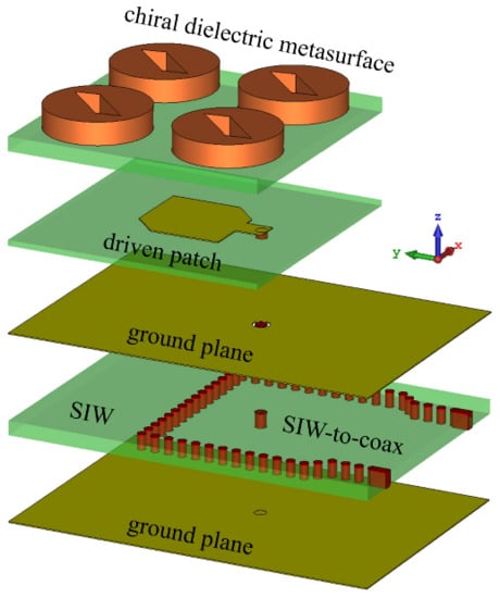 The antenna consists of five parts referred to as (i) the bottom ground plane; (ii) a substrate integrated waveguide (SIW) with a SIW-to-coax feeding; (iii) a ground plane film; (iv) a coax-fed driven patch antenna; and (v) a chiral dielectric metasurface consisting of a array of slotted dielectric cylinders. The ground plane films were considered to be made of lossy copper. A top-view and side-view of the main building elements of the antenna design are presented in Figure 2.