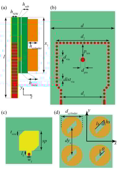 The SIW-based feeding layer is etched on a slab of Rogers RT/duroid 5880 (, ), with thickness mm. A ground plane, mm thick, was used to separate the SIW-feeding and the coax-fed driven-patch antenna. A CDM is stacked at the top of the structure, consisting of four slotted cylinders made of a ceramic dielectric material with , layered on a low-permittivity substrate of RT/duroid 5880 ( mm). The cylinders had a height mm and diameter mm, and were separated by a center-to-center distance of mm. The slots at the center of the cylinders were parallelograms whose sides were labeled as and and the tilting angle is . The slots are rotated by an angle with respect to the y-axis, as depicted. CDM is fed by a driven patch localized below the low-permittivity layer at the center of the metasurface. The patch made of lossy copper had rectangular sides and corner cuts . The coax-to-patch feeding line has a width mm and length mm. The SIW-feeding structure is amenable to integration with planar front-end circuits. The SIW structure was designed as a rectangular waveguide input, forming a SIW-to-coax transition where the distance between the pin and the shorting wall was tuned for impedance matching [24,25]. The dimensions of the SIW-feeding and the remaining parameters are listed in the caption of Figure 2. It is worth mentioning that with the antenna size taken as ( at the center frequency of 28.5 GHz), our concept enables the application of phase-arrayed antenna systems by designing the structure to be directly fed by a coax-wire.
