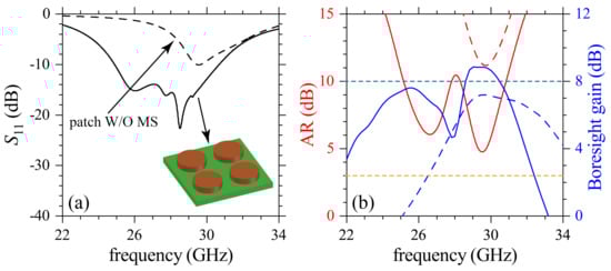 Numerical results for (a) and (b) AR and boresight gain. Solid and dashed lines are for the patch antenna with and without (W/O) the DR metasurface. Simulations were carried out using the commercial software CST Studio. Horizontal dashed lines in (b) are eye guides for dB and boresight gain = 8 dB.