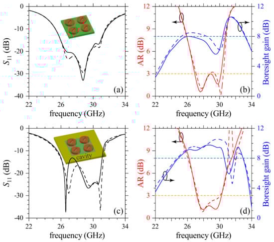Numerical results for , AR and boresight gain are presented for the CDM-based antenna (a,b) with and (c,d) without the metal cavity. Simulations from CST Studio and ANSYS HFSS are indicated by solid and dashed lines. Horizontal dashed lines in (b,d) are eye guides for dB and boresight gain = 8 dB.