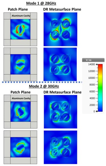 Following the reasoning of chiral dielectric metasurfaces for enhanced chiroptical effects [18], we considered slanted slots etched at the center of each cylinder, as schematized in the inset of Figure 4a. This mechanism not only improved AR but also the whole operating performance of the antenna, as it can be seen from Figure 4a,b. Calculations from CST Studio and ANSYS HFSS are presented with solid and dashed lines, respectively. Negligible differences are observed due to different convergences of the software packages. The applicability of this CDM-based CP antenna is demonstrated in Figure 4c,d with AR and gain corresponding to the system surrounded by a metal cavity (considered to be made of Al). This cavity surrounding the four-element CDM enables integration into antenna arrays by suppressing the mutual coupling between adjacent elementary cells. Although a small decrease was induced by the cavity in the impedance and 3-dB , in relation to the impedance and 3-dB for the system without cavity, the corresponding gain () and AR () were considerably improved. Moreover, a gain notch from Figure 4b was shifted out of the bandwidth range of interest when using the cavity, which certainly improves the CP radiation performance. Figure 5 shows the -field distribution for the two orthogonal modes of the patch coupled to the CDM. These fields were calculated for the frequencies at which AR achieves the best results, according to Figure 4d. For illustrative purposes, results are presented for -field distribution at the patch and CDM planes, and with radiation of an LCP electromagnetic field. As it can be inferred, an RCP antenna can be developed using the mirror image of CDM and the patch antenna. The evanescent behavior of the electromagnetic field in the cavity is also shown.