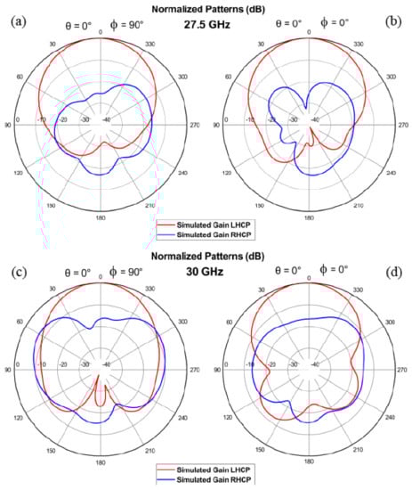 The numerical results from hereon were obtained with the commercial software CST Studio for the antenna without the cavity. Results of the LCP (co-polarized) and RCP (cross-polarized) radiation patterns for the CDM-based antenna are presented for 27.5 GHz and 30 GHz in Figure 6a–d, respectively. For the co-polarized radiation at the -plane, a 3-dB power beamwidth of (in the range from to ) is observed for 27.5 GHz (Figure 6a) while for 30 GHz it is (from to ) (Figure 6c). The condition -dB is met when the difference between the co-polarized and cross-polarized patterns is -dB. Therefore, there is a high AR performance in the whole 3-dB power beamwidth for the 27.5 GHz mode, but not for 30 GHz which is limited to (from to ). In the case of -plane, there is nearly the same 3-dB power beamwidth for both modes, (in the range from to ) for 27.5 GHz and (in the range from to ) for 30 GHz. However, the 3-dB AR performance for 30 GHz exhibits a very narrow beamwidth of (from to ), in contrast to 27.5 GHz that stays with at least 15-dB difference between the co-polarized and cross-polarized radiation patterns in the whole 3-dB power beamwidth. Hence, the area covered by the 27.5 GHz mode is larger than for the 30 GHz.