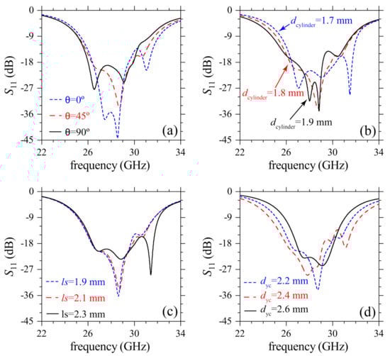 Simulated parametric study for the reflection coefficient of the proposed antenna. (a) variation of , (b) variation of , (c) variation of and (d) variation of .